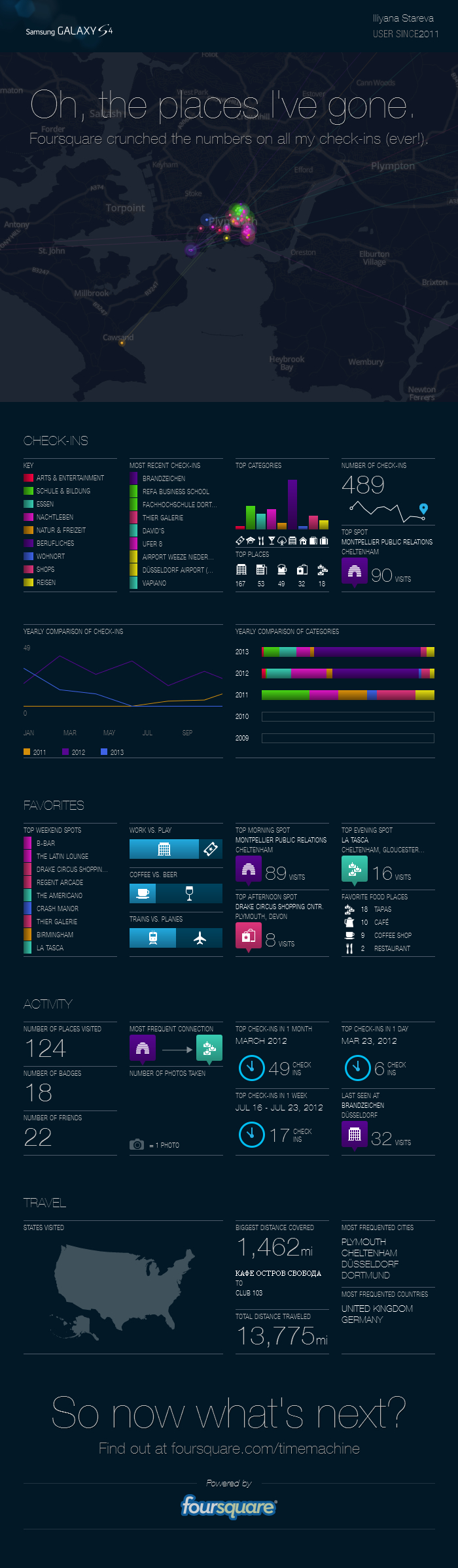 Here’s some thrilling news for all Foursquare fans – from now on you can request and visualise your entire check-in history and you can even have it in the form of an infographic! Foursquare calls this the Foursquare Time Machine! Isn’t that cool?