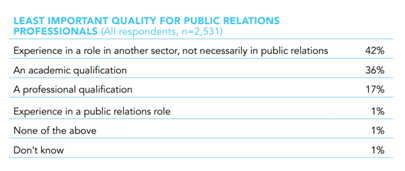 - Overall, there is a low level of academically or professionally qualified practitioners in PR and an overwhelming preference for "on the job" experience and learning as the most important indicator of professional standards (68%).