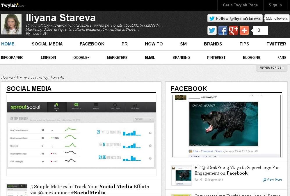 To have a profile on Twylah you need an invite as it is still in beta, but it only takes a few days and it is worth waiting for (it's also free!). Here’s my Twylah page so that you can have an idea of what it looks like. Basically it shows all my trending topics, i.e. the keywords I use the most, which obviously are Social Media, Facebook, PR etc.